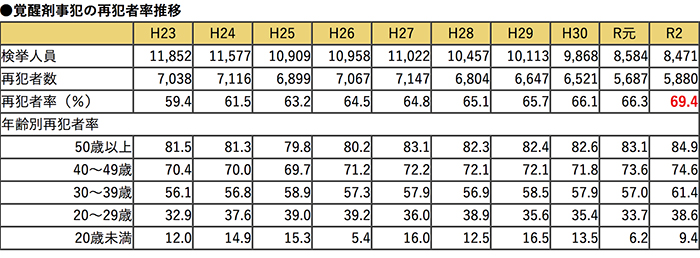 ご存知の通り薬物事犯の再犯者率は現在でもおよそ7割に及んでいる。しかも年代が上がるごとに再犯者率も上がり、50代以上では84.9%にも及んでいる。