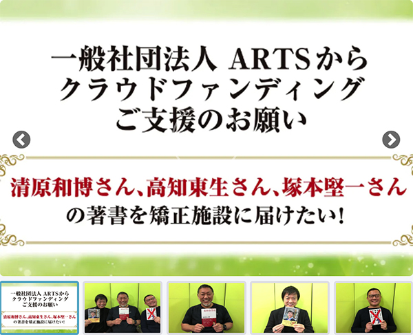 ▲画像 出典:一般社団法人ARTSが立ち上げた「清原和博さん、高知東生さん、塚本堅一さんの著書を矯正施設に届けたい」クラウドファンディングサイト