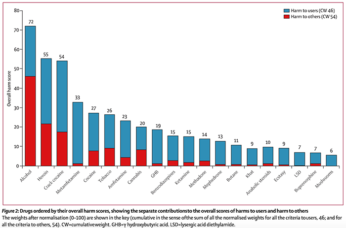 ▲図 各種薬物等の危険度を示すグラフ。左からアルコール、ヘロインと続く。大麻(Cannabis)は左から8番目で、タバコ(Tobacco / 左より6番目)よりも右に位置する。 出典:Drug harms in the UK: A multi-criterion decision analysis/ The Lancet / ResearchGate
