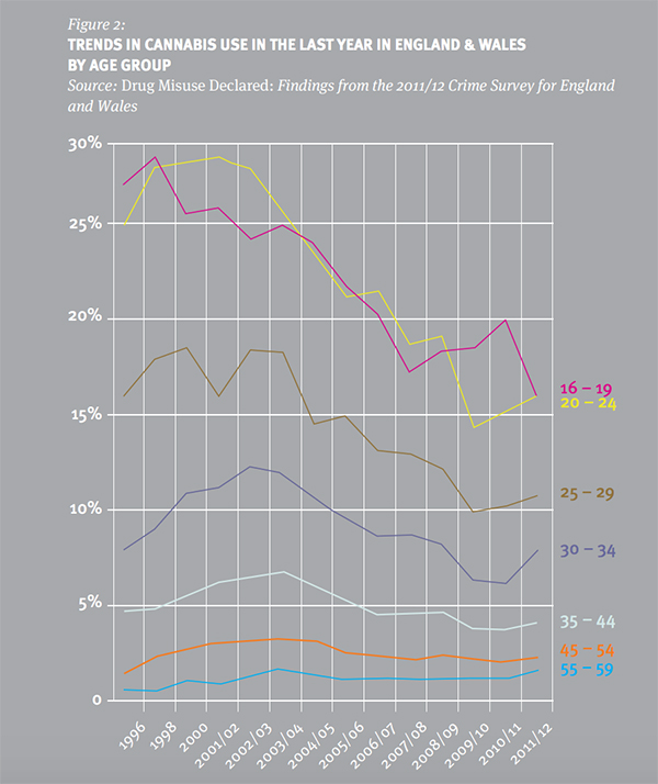 ▲図 <Figure2>イングランドとウェールズでの「年齢層別の大麻使用動向」 出典:A FRESH APPROACH TO DRUGS October 2012 / THE FINAL REPORT OF THE UK DRUG POLICY COMMISSION