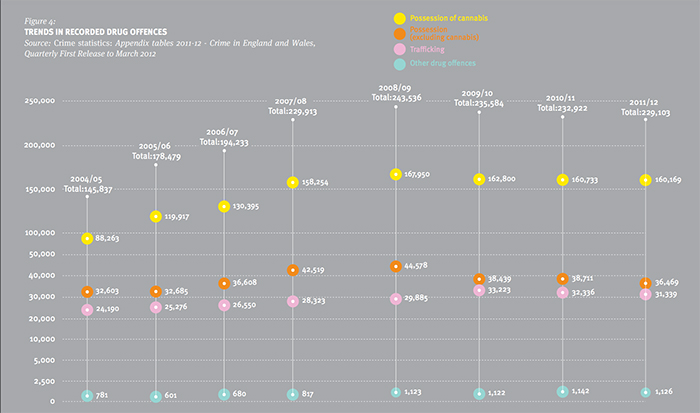 ▲図 <Figure4>イングランドとウェールズでの薬物犯罪動向。黄色い丸が大麻所持の検挙数。 出典:同上