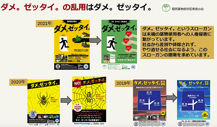 その証拠に、薬物問題に関わる支援者、当事者、家族が2019年から「『ダメ。ゼッタイ。』キャンペーンを別のスローガンに代えて欲しい」と嘆願を入れているが、「検討する」と答えながら一切変更をしない。そして今年もまた、「ダメ。ゼッタイ。」のポスターが税金を使って大量に作られたのである。