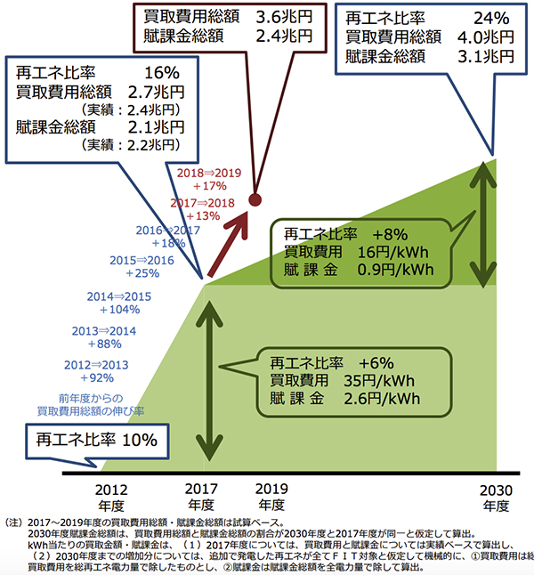 ▲図 再エネ買取費用総額と賦課金総額の推移 出典:経済産業省