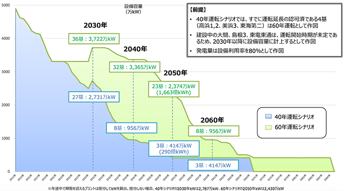 ▲図 国内の原子力発電所の将来の設備容量の見通し 出典:経済産業省資源エネルギー庁「原子力政策の課題と対応について」(令和3年2月25日)