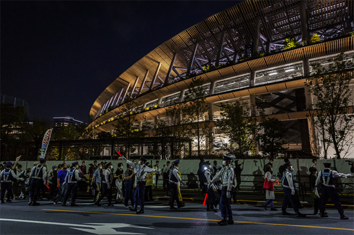 ▲写真 新国立競技場前で五輪開催に抗議するデモ行進(2021年5月9日) 出典:Yuichi Yamazaki/Getty Images