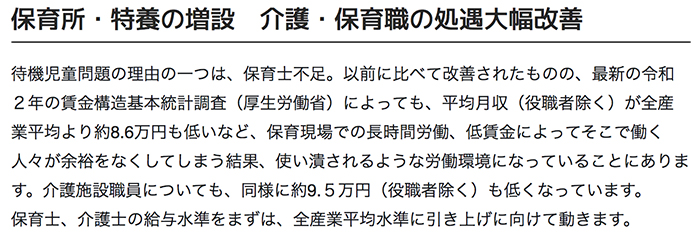 「全産業平均より低い」事実を踏まえ、できることは「引き上げに向けて動く」ことだと。こうした政策に、①②の特徴が明らかになっている。
