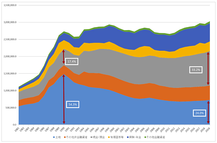 30年間の停滞の背景は、個人が保有する土地の評価額の下落です。その推移を追ってみると、1981年には538.9兆円でしたが、バブル経済の拡大とともに一気に増加し、1990年には1,485.4兆円と、ほぼ3倍に達します。その時の個人資産に占める比率はなんと54.3%でした。