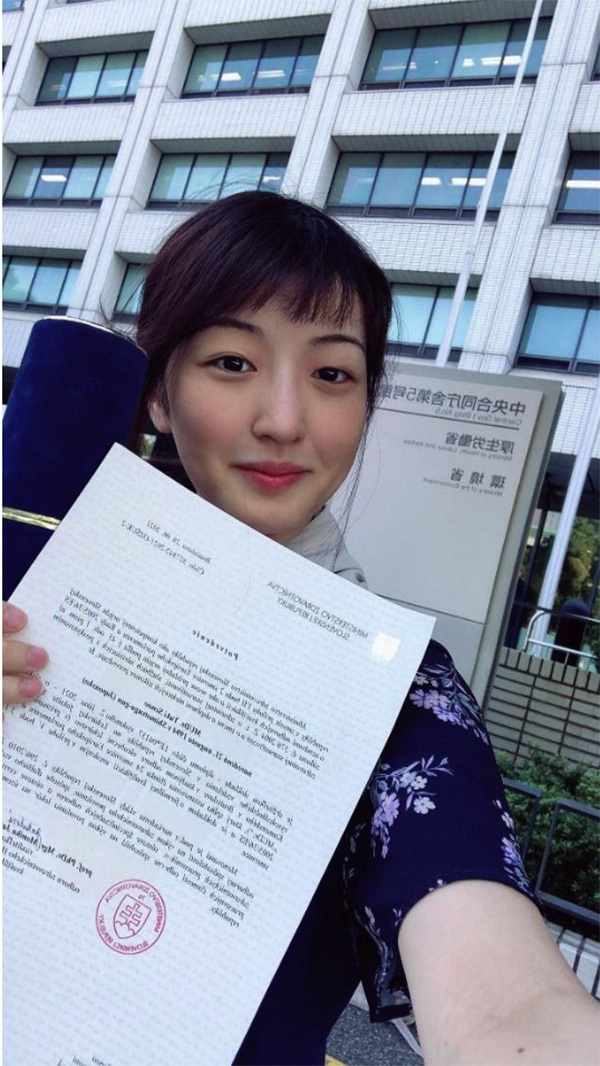 ▲写真 妹尾優希さん。来春の医師国家試験の準備手続きを始めるため、厚労省に欧州での卒業証書、医師免許を持参した。(筆者提供)