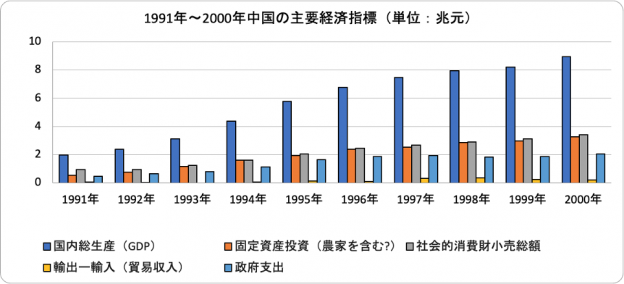 〔出所〕中国国家統計局、各年の「国民経済と社会発展統計公報」(速報値)。政府支出については”理論値”。各年の貿易黒字については、その年の米ドルから人民元への為替レート平均値。なお、1991年~2000年まで、固定資産投資に農家が含まれるのか否か不明。