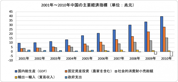 〔出所〕中国国家統計局、各年の「国民経済と社会発展統計公報」(速報値)。政府支出については”理論値”。各年の貿易黒字については、その年の米ドルから人民元への為替レート平均値。なお、2001年~03年まで、固定資産投資に農家が含まれるのか否か不明。