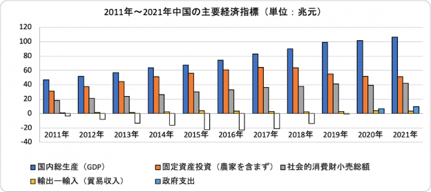 〔出所〕中国国家統計局、各年の「国民経済と社会発展統計公報」(速報値)。2021年は上半期からの予測値。政府支出については”理論値”。なお、2011年と2012年の貿易黒字については、その年の米ドルから人民元への為替レート平均値。(2021年を除く)他の年は当局の発表通り。
