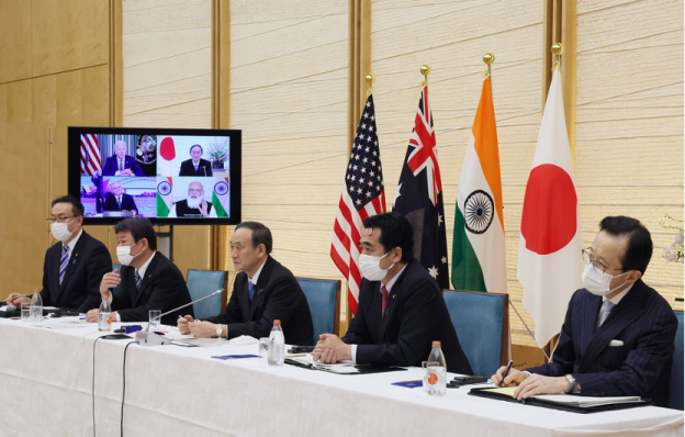 写真)日米豪印首脳テレビ会議に臨む菅首相 2021年3月12日
