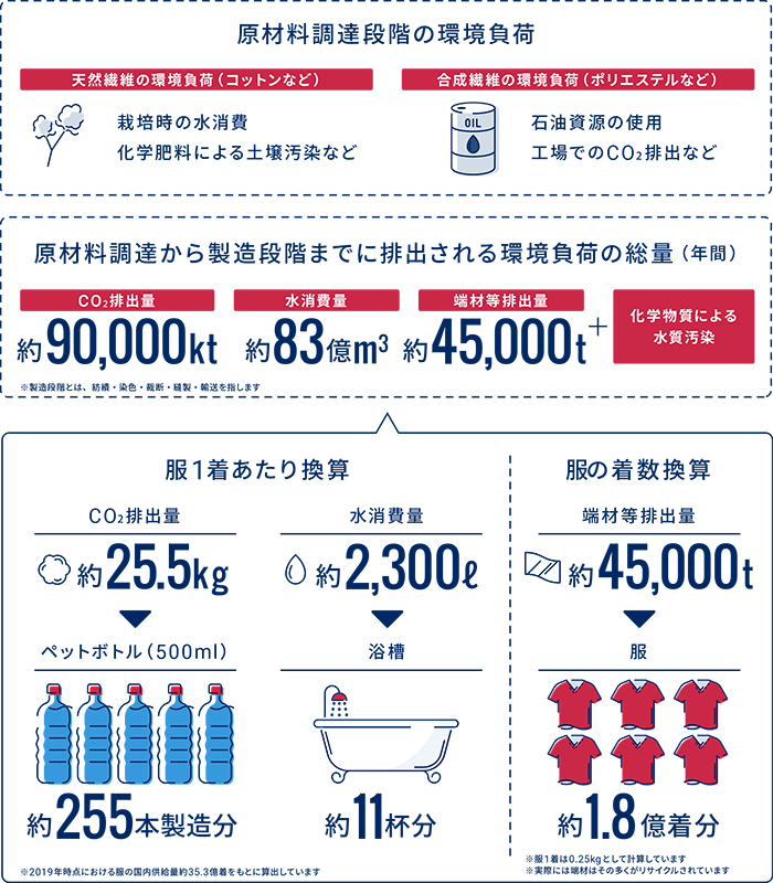 衣服の製造には、私たちが想像する以上に多くの資源が使われている。環境省によれば、服1着を製造するために排出されるCO2は約25.5kg、使用される水資源は約2300ℓ(浴槽約11杯分)にも上る。