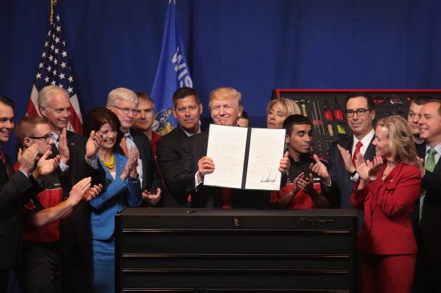 画像)2017年4月18日、H-1Bビザの刷新に関する大統領命令にサインしたトランプ大統領(当時)出典)Photo by Scott Olson/Getty Images[/caption]