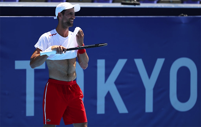 ▲画像 東京2020オリンピックで、2021年7月22日、有明テニスの森での練習中汗を拭うジョコビッチ選手 出典:Photo by Clive Brunskill/Getty Images