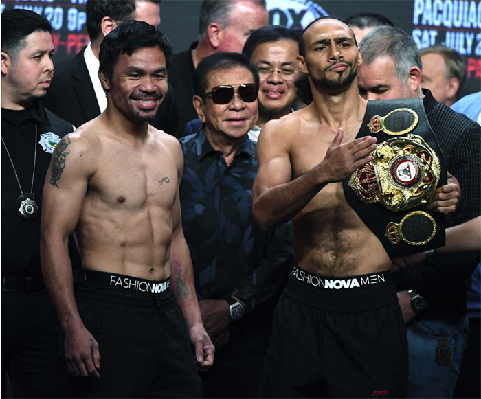 ▲写真 WBAウェルター級チャンピオンのマニーパッキャオ(左)とWBAウェルター級スーパーチャンピオンのキースサーマン(右)ネバダ州ラスベガスで開催されるMGMグランドガーデンアリーナにて(2019年7月19日) 出典:Photo by Ethan Miller/Getty Images