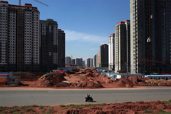 ▲写真 内モンゴル自治区オルドス市康巴什新区付近に建設された集合住宅の密集地帯(2011年8月16日) 出典:Photo by In Pictures Ltd./Corbis via Getty Images