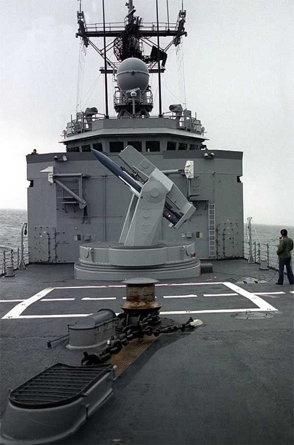 ▲写真 SM-1のダミーミサイル。旧式であり終始誘導が必要で1発射つと命中するまでは次弾は撃てない。誘導装置は艦橋上の卵型レーダ内部と艦橋裏のマーカライト風の2つある。ただ成功型は同時並行に使えるかは不明。 出典:Photo by PH1 Jeff Hilton, USN、Defense Visual Information Center – U.S. Department of Defense (DOD)