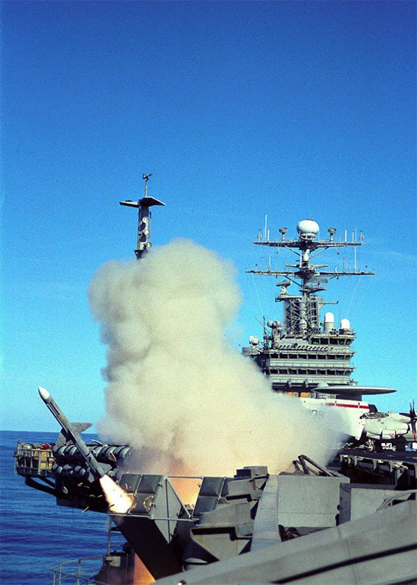 ▲写真 航空母艦USSカールヴィンソンがシースパローミサイルを発射(2002年1月5日)成功級の不利はESSMブロック2搭載で改善する。誘導負担は小さいため多数連続発射が可能となる。またブロック1だが豪海軍同型艦への改装搭載例もある。 出典:Photo by Mai/Getty Images