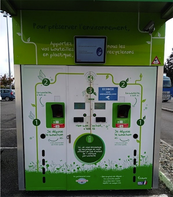 また、フランスでは、ペットボトルのリサイクルのための機械が設置されているところも増えてきた。一つ1ソンチームに換算してお店で使えるチケットをくれる。赤や緑などの色が着いたボトルは、機械に入れてはいけないことになっている。