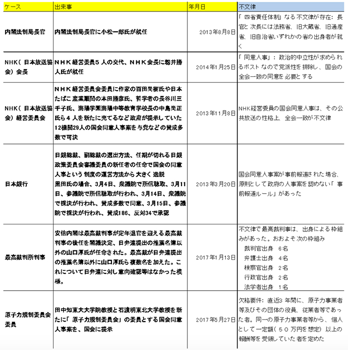 ▲表 【出典】安倍政権が破った「不文律」(人事面):筆者製作