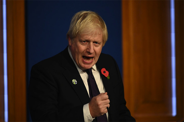 ▲画像 11月14日、記者会見でCOP26について報告するイギリスのジョンソン首相 出典:Photo by Daniel Leal – WPA Pool/Getty Images