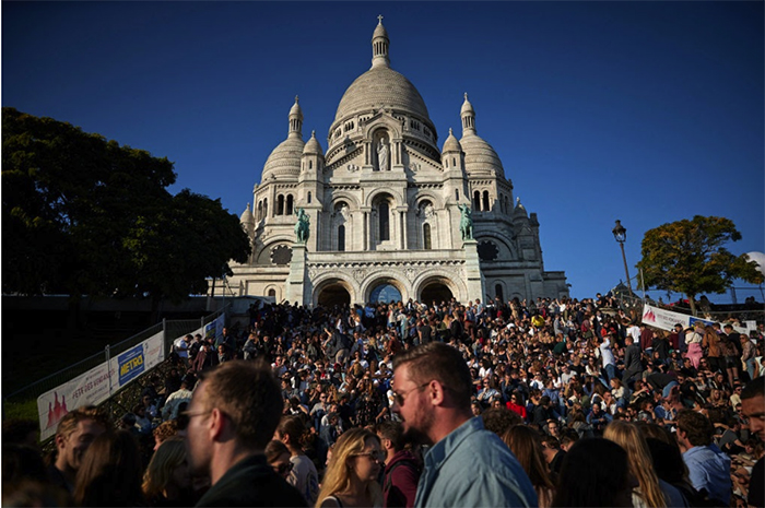▲写真 パリワイン収穫祭に集まる市民らで混雑するモンマルトル差クレクール寺院前(フランス・パリ、2021年10月9日) 出典:Photo by Kiran Ridley/Getty Images