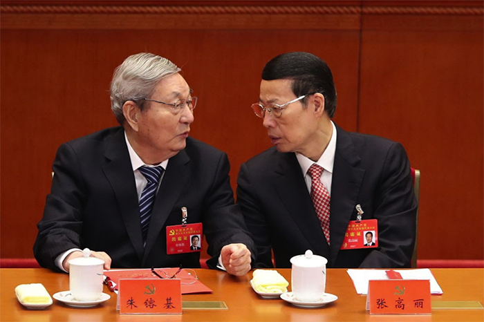▲写真 第19回共産党会議の閉会式にて。朱鎔基元首相と張高麗前副首相(2017年10月24日、中国・北京で) 出典:Photo by Lintao Zhang/Getty Images