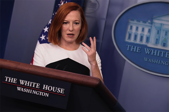 ▲写真 米国の北京冬季五輪の「外交的ボイコット」を表明するサキ報道官 (2021年12月6日) 出典:Photo by Chip Somodevilla/Getty Images
