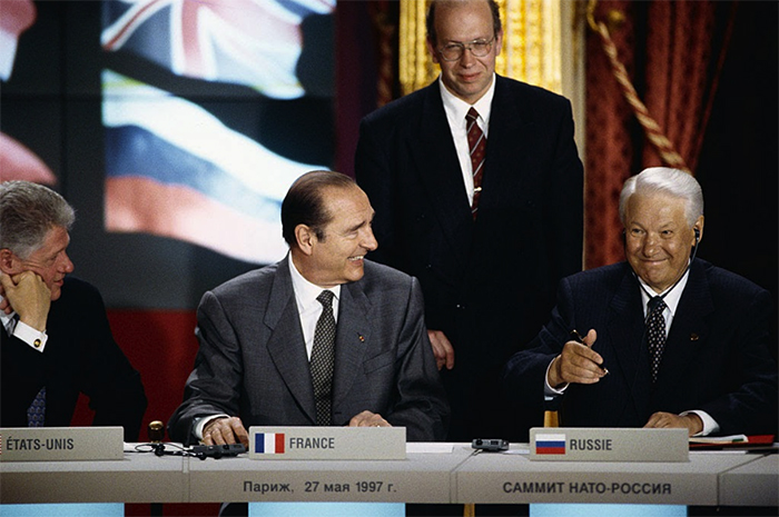 ▲写真 「NATO・ロシア基本文書」の調印式で、イェリツィン大統領の話しを聞くクリントン米大統領とシラク仏大統領。1997年5月27日 仏エリゼ宮にて。 出典:Photo by © Wally McNamee/CORBIS/Corbis via Getty Images