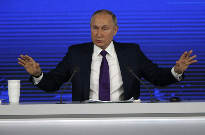 ▲写真 年末記者会見に臨むプーチン露大統領(2021年12月23日) 出典:Photo by Mikhail Svetlov/Getty Images