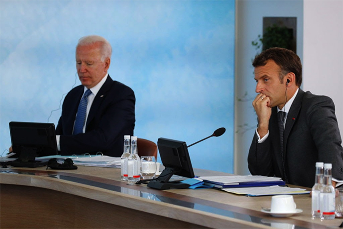 ▲写真 AUKUS発足に伴い、バイデン米大統領(左)はマクロン仏大統領(右)を激怒させた。写真は英コーンウォールで開催されたG7サミット全体会議に出席する2人(2021年6月13日) 出典:Phil Noble – WPA Pool/Getty Images