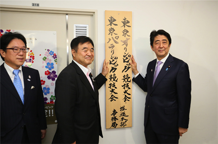 ▲写真 東京オリンピック競技大会・東京パラリンピック競技大会推進本部発足、看板かけの様子/五輪担当相のポストは今年3月末まで盲腸的に残置されている。特に何の役にも立たない純粋な陪食大臣である。その無価値の含意も含めて北京冬季五輪に送りつけるには最適の配置である。 出典:首相官邸
