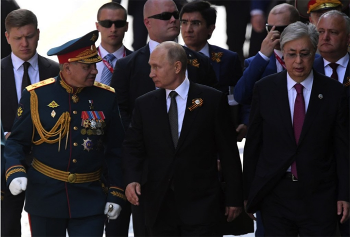 ▲写真 第二次世界大戦勝利75周年記念パレードに出席するロシアプーチン大統領、ロシアセルゲイ・ショイグ国防相(左)、カザフスタンのカシム・ジョマート・トカエフ大統領(右)2020年6月24日、ロシア・モスクワ 出典:Photo by Kirill Kallinikov – Host Photo Agency via Getty Images