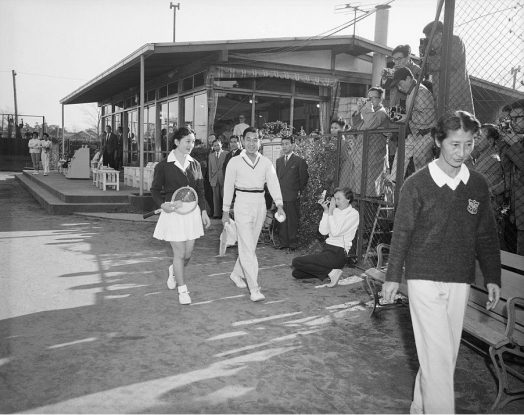 写真)皇太子・明仁親王と正田美智子さん(1958年12月6日当時、テニスコートにて)。