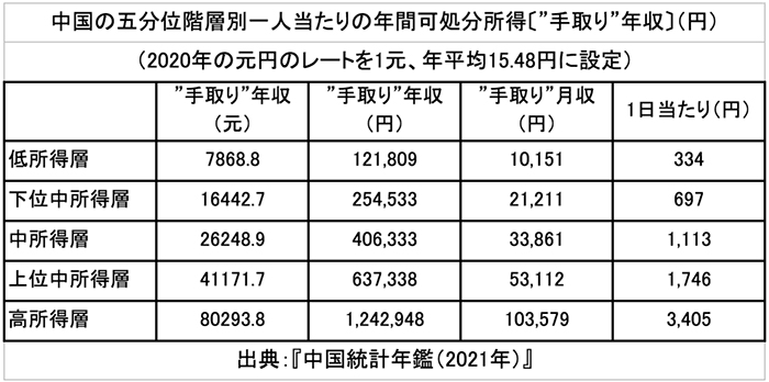 『中国統計年鑑』(2021年版)を参考にしながら、「中国の1人当たりの年間可処分所得(税金や社会保険料を除いた“手取り”)」について考えてみたい。なお、最新の統計は、一昨年(2020年)の数字である(ここでは「購買力平価」を捨象する)。