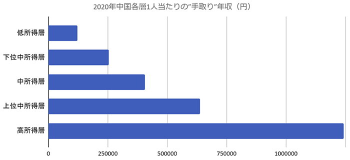 さて、各層の1年間の可処分所得(いわゆる「“手取り”年収」)は、(1)低所得層は7868.8元(約12万1809円)、(2)下位中所得層は1万6442.7元(約25万4533円)、(3)中所得層は2万6248.9元(約40万6333円)、(4)上位中所得層は4万1171.7元(約63万7338円)、(5)高所得層は8万0293.8元(約124万2948円)である(図表を参照のこと)。
