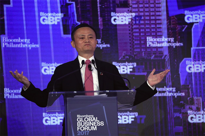 ▲写真 アリババグループ創業者のジャック・マー氏(2017年9月20日、ニューヨーク市で開催されたブルームバーググローバルビジネスフォーラムで講演) 出典:Photo by John Moore/Getty Images