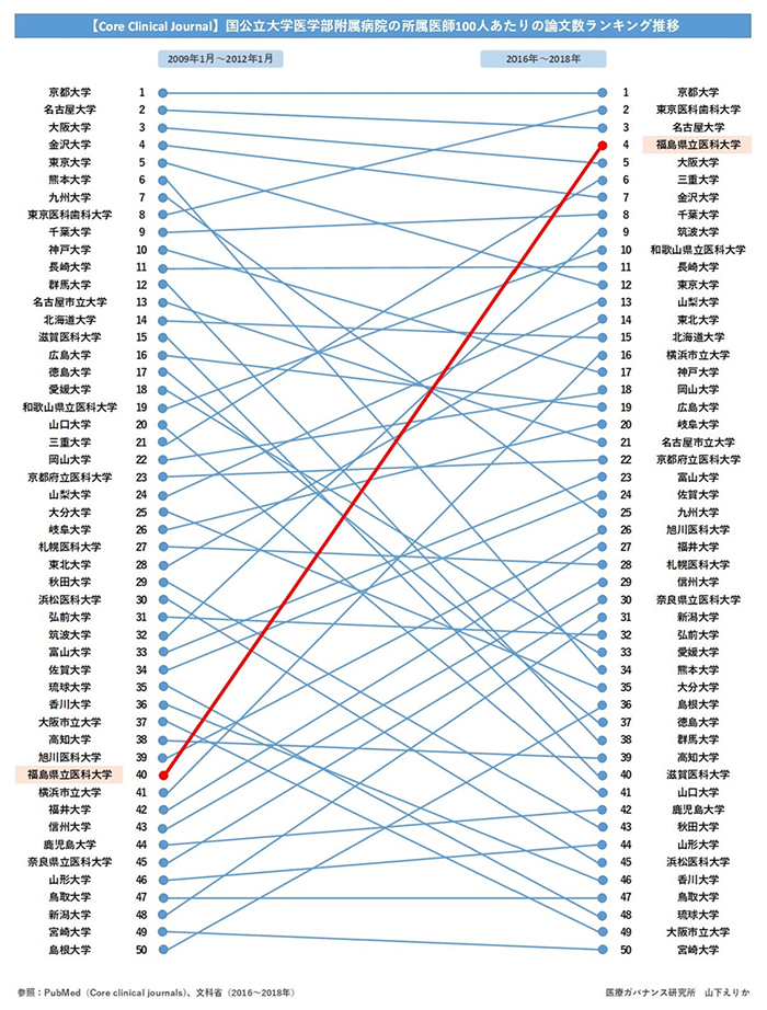 通産官僚、参議院議員として、様々な立場の人を知っている鈴木氏の発言は説得力があった。坪倉氏は、大学卒業後、亀田総合病院、帝京大学ちば総合医療センター、都立駒込病院勤務を経て、2011年4月に福島県浜通りに飛び込む。その後、一貫して現地で診療と研究を続け、いまや、放射線災害の世界的権威となった。昨年3月には米『サイエンス』誌が、その活動を5ページで特集している。坪倉氏をはじめとした若手研究者がリードし、震災後、福島県立医科大学は英文の医学論文数を激増させている(図1)。