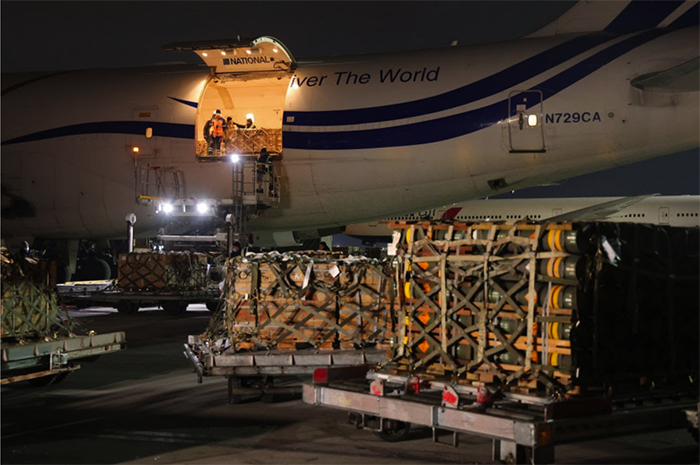 ▲写真 米軍によってウクライナに運ばれる対戦車ミサイルなどの武器。ロシアによるウクライナ侵攻の可能性に対して、米、英、その他のNATO諸国はウクライナに武器を送っている。(2022年1月25日、ウクライナ・キエフ近郊のボルィースピリ空港) 出典:Photo by Sean Gallup/Getty Images