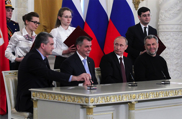 ▲写真 クリミア首相セルゲイ・アクショーノフ、クリミア国家評議会議長ウラジミール・コンスタンティノフ、ロシア大統領ウラジミール・プーチン、アレクセイ・チャリ セバストポル市長が調印式に臨む モスクワ・クレムリン宮殿 (2014年3月18日) 出典:Photo by Sasha Mordovets/Getty Images