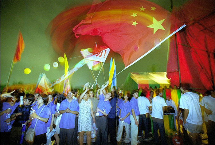 ▲写真 2008年夏季オリンピック開催地に決まったことで歓喜する中国人。(2001年7月13日、中国) 出典:Photo by Kevin Lee/Getty Images
