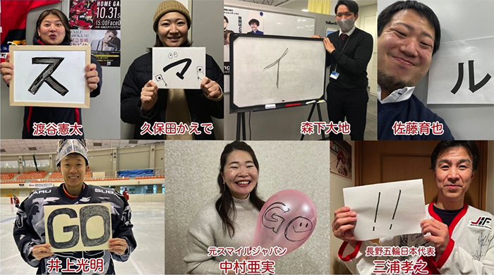 ▲写真 応援メッセージを送る中村さん、三浦さん、日光アイスバックスの井上光明選手ら (写真提供:日ア連アスリート委員会)