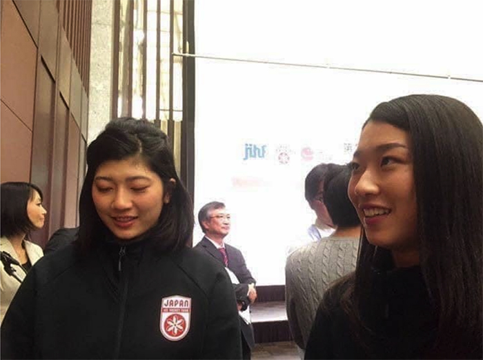 ▲写真 エールを送るスマイルジャパンOGの中村さん(写真左)、足立さん。ソチ五輪壮行会にて(筆者撮影)