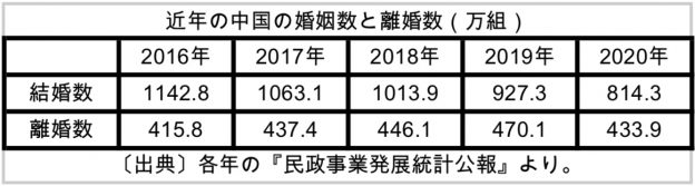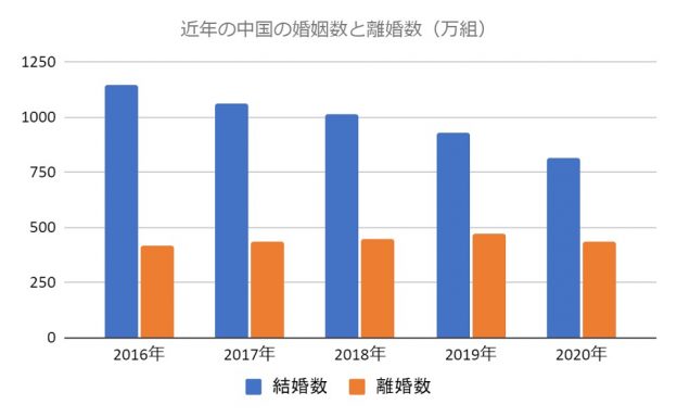 中国が(「1人っ子政策」より)「2人っ子政策」に転じた2016年から2020年までの5年間の婚姻数の推移である。明らかに右肩下がりとなっている。そして、2019年、婚姻数が1,000万組を割り込み、927.3万組となった。コロナ禍の翌年には、前年比113万組も減少(-12.2%)している。