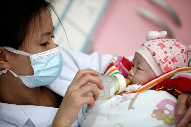 写真)ミルクを与えられる新生児(2013年 中国・安徽省)
