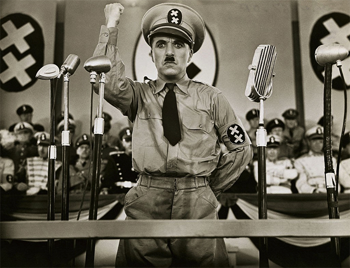 ▲写真 映画「独裁者」で、ナチスドイツの風刺である独裁者のアデノイド・ヒンケルを演じる俳優兼監督のチャーリー・チャップリン(1940年1月1日) 出典:Bettman/GettyImages
