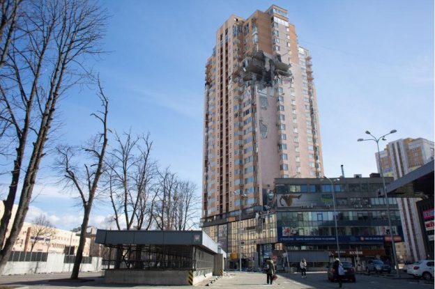 写真)ロシアのミサイル攻撃を受けた首都キエフのアパート 2022年2月26日 ウクライナ・キエフ