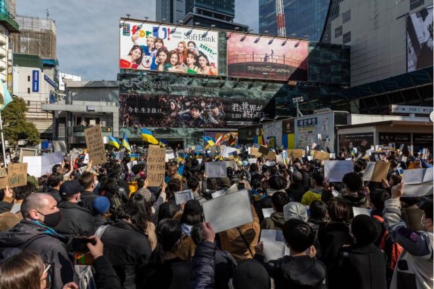 東京都内では26日、日本国内でもウクライナ出身者だけでなく、ロシア出身者らもデモで「戦争反対」を叫んだ。