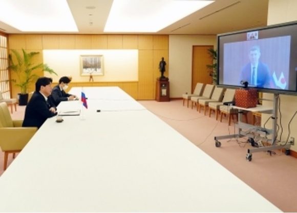 写真)レシェトニコフ、マクシム・ゲンナジエヴィチ・ロシア連邦経済発展大臣と貿易経済に関する日露政府間委員会共同議長間会合に臨む林芳正外相 2022年2月15日 東京・外務省